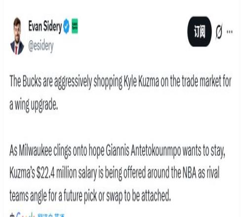北京时间12月30日,据名记Sidery报道,雄鹿队正在交易市场上积极兜售库兹马,以期通过交易升级球队的侧翼阵容。